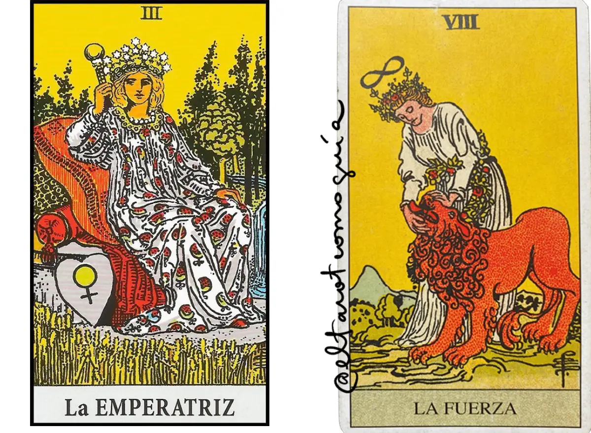 - Fortaleza interior: La Emperatriz y la Fuerza juntas recuerdan que la verdadera fuerza viene de dentro.